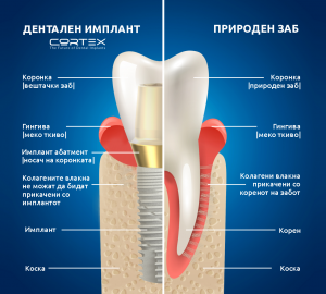 Забната протетика поддржана од имплант тесно се доближува до природните заби. Коронките водат со нивниот природен изглед, имплантите со нивната стабилност, а двете заедно со нивното позитивно влијание врз функционалното зачувување на целиот мастикаторен апарат.