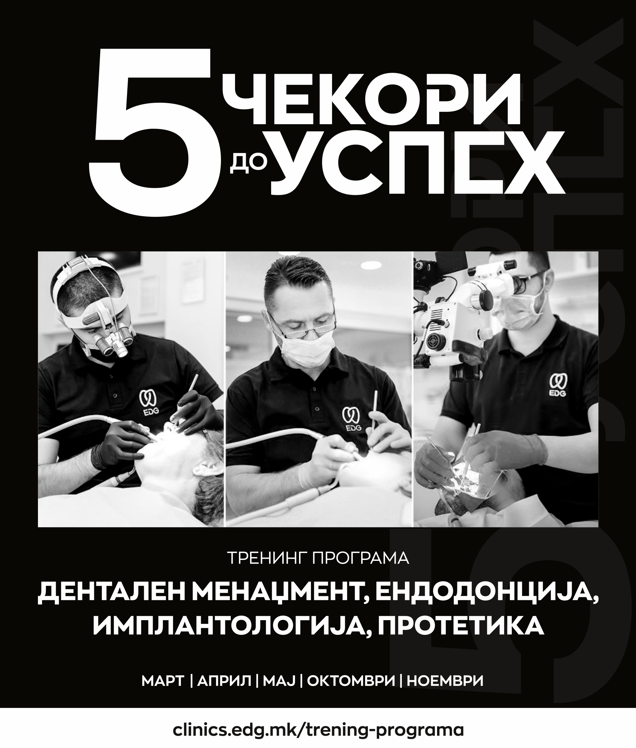 Тренинг програмата на EDG Групацијата опфаќа теоретски и практични вежби со кои лично се стекнувате со научни сознанија и практични вештини од различни области на забната техника.